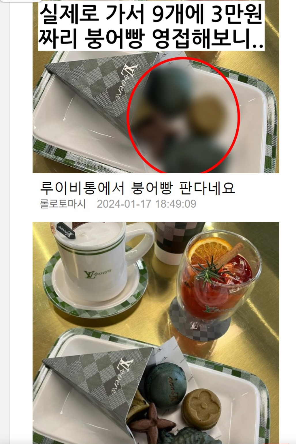 오늘 기사 중에 루이비통 카페에 한시 메뉴로 붕어빵이 9개에 3만원인데 시그니처 모양의 미니 빵이 종이패키지에 담긴 것이 인스타그래머블해서 반응이 좋단다.