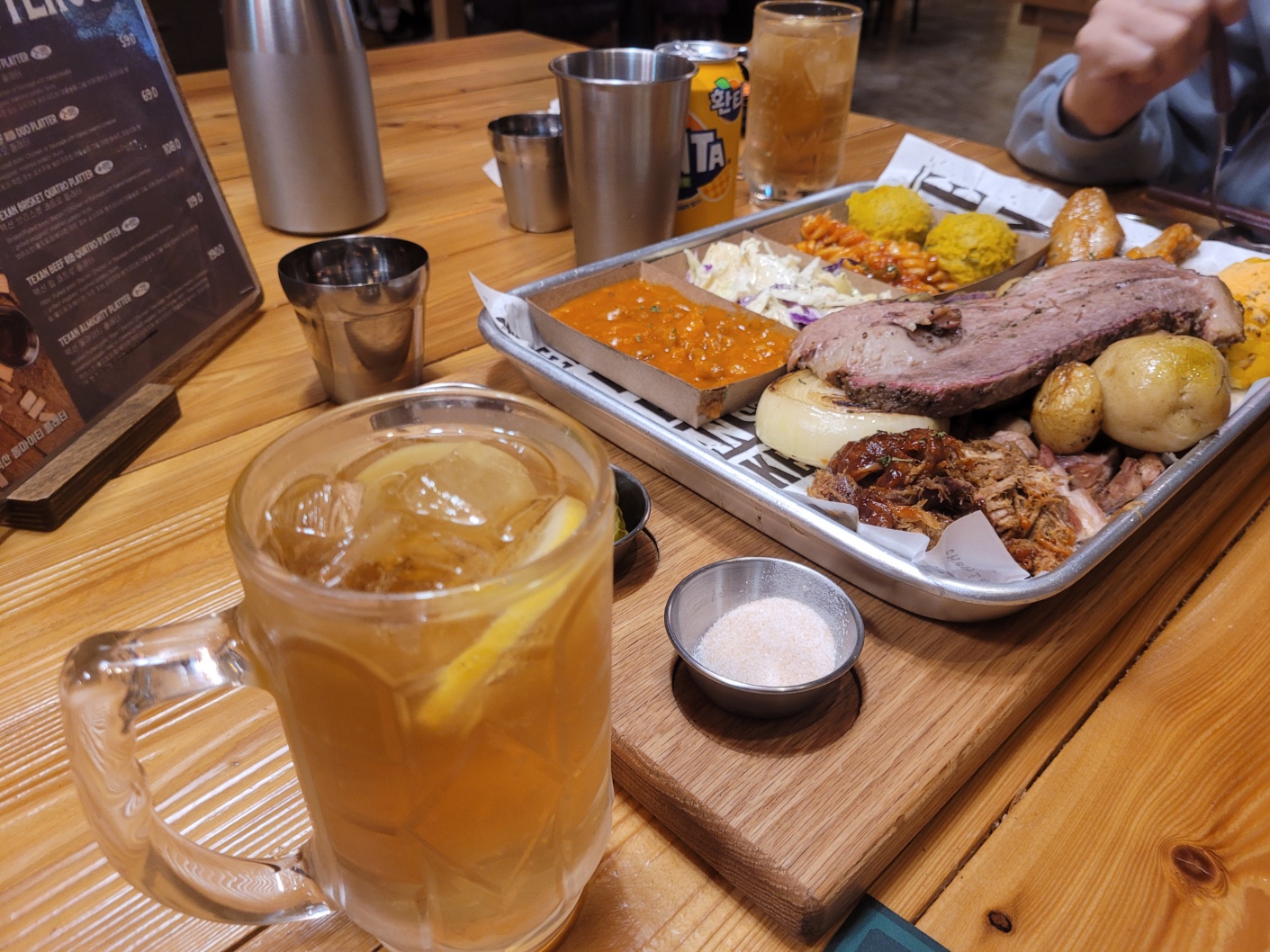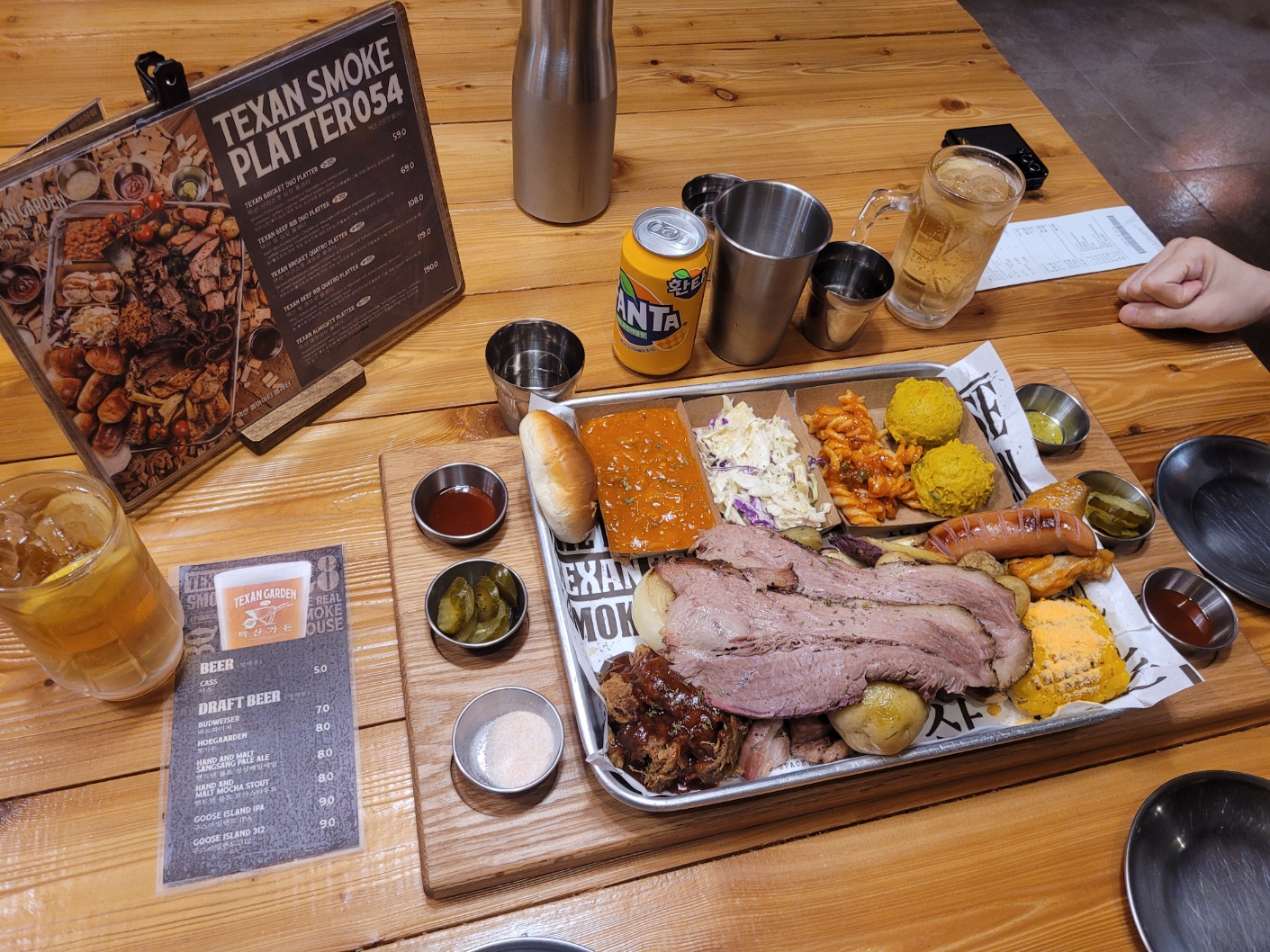 주방에는 큼직한 바비큐 장비가 있어서 시선을 끌었는데 숙성과 오랜시간 조리된 고기를 맛보는 색다른 경험이 여행에 더 흥미를 더해준 듯하다. 우리는 택산 브리스켓 듀오 플래터를 먹었다. 립도 좋지만 뼈를 발라먹는것이 왠지 귀찮은 생각이 들었다. 여기에 음료는 환타, 하이볼 두잔을 시켰다. 맥주, 위스키도 준비되어 있어서 바비큐와 곁들이기 좋았다.