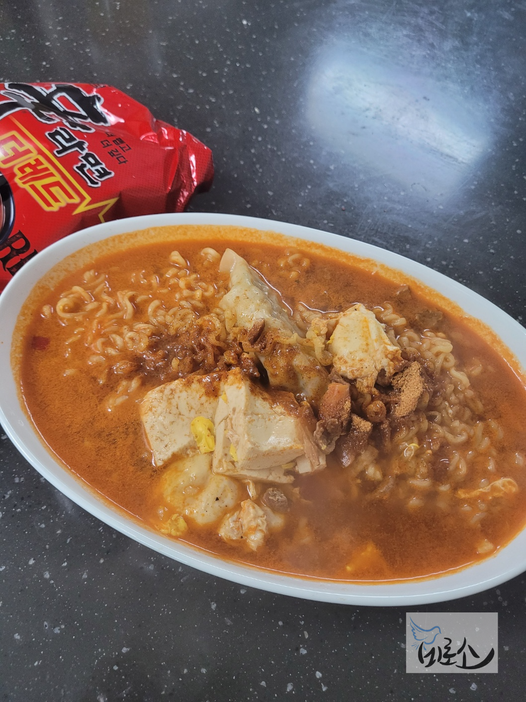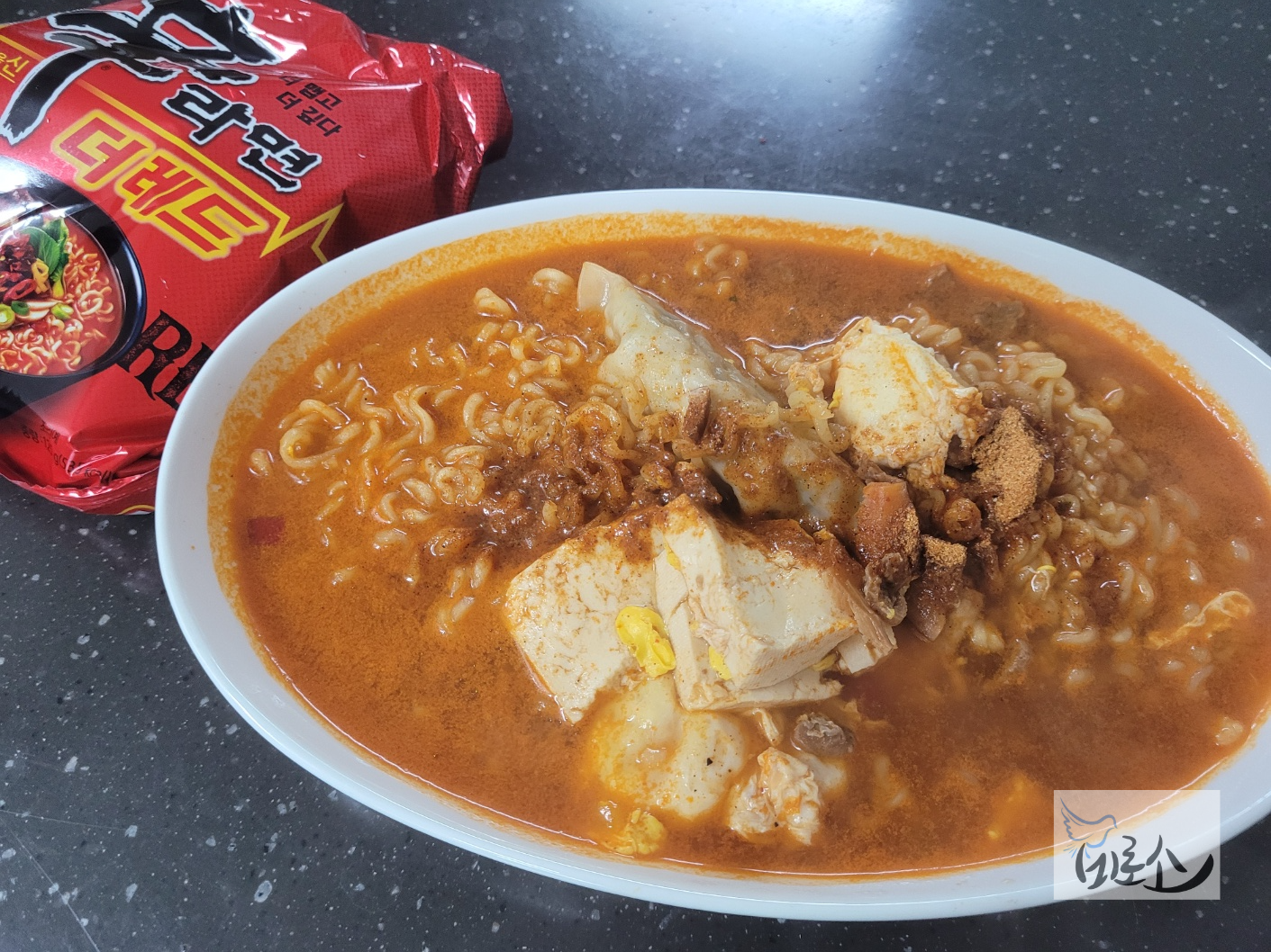그래서 끓여본 신라면 더레드(시식은 남편이 했다.) 라면은 면과 스프, 후첨스프 구성이다. 매운 맛에 집중해서 나트륨 함량이 높은 게 걸려서 두부와 계란을 넣었다. 나는 국물맛을 해치지 않기 위해 계란을 풀지 않는 것이 예의라고 생각한다.