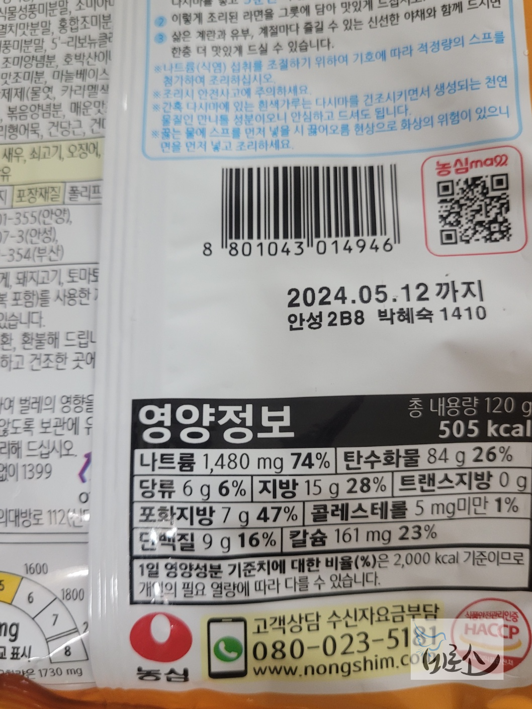 같은 농심에서 나온 너구리 순한맛의 영양정보와 비교해볼 수 있게 사진을 찍어 두었다. 너구리는 505kcal로 신라면 더레드에 비해 총 내용량(후첨스프용량 차이?)부터 영양정보면에서 대부분 조금씩 적게 들었다. 특히 나트륨은 하루 권장량의 74%로 신라면보다 준수한 편이다.