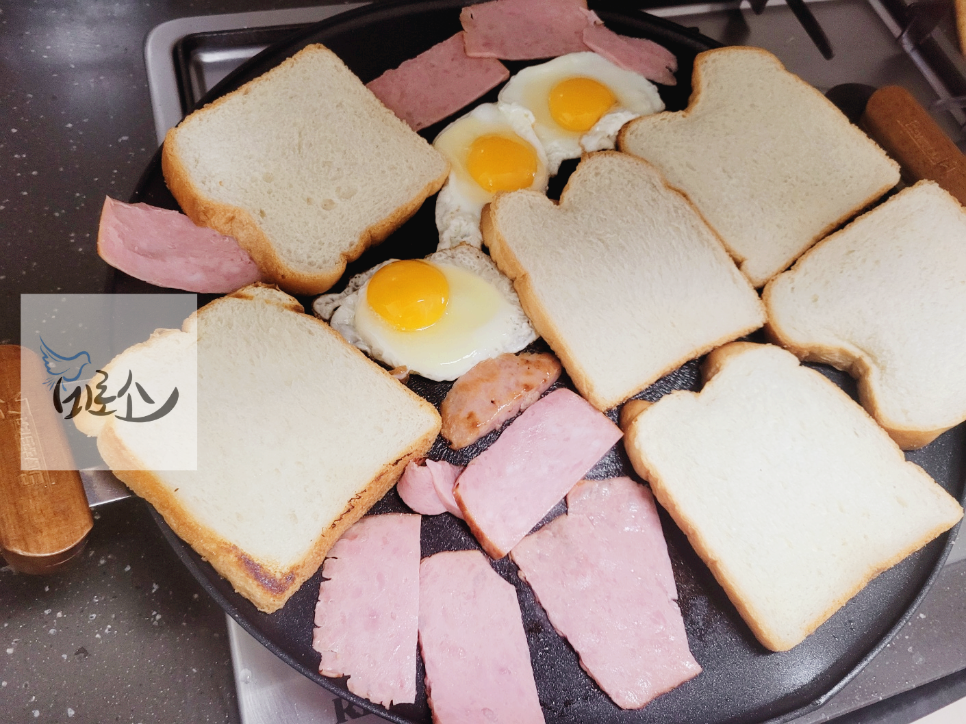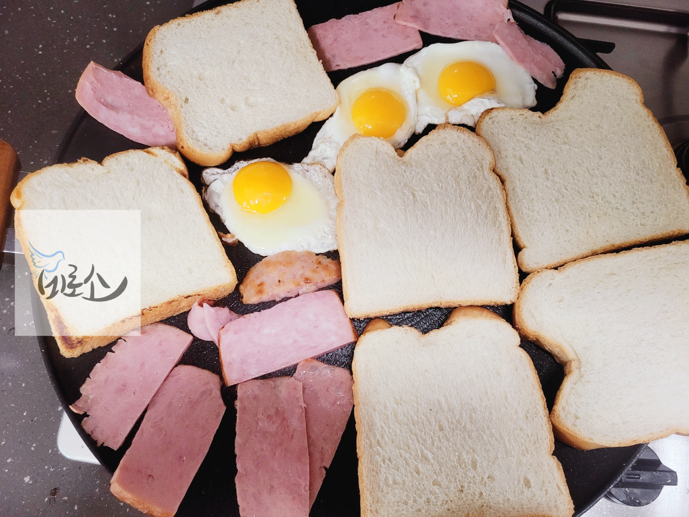 계란이 조금 익기 시작하면 식빵을 올리고 틈사이사이에 햄을 올려 함께 구워주었다. 그야말로 원팬 토스트다. 3인 가족에 최적화 된 메뉴라고 할 수 있다.