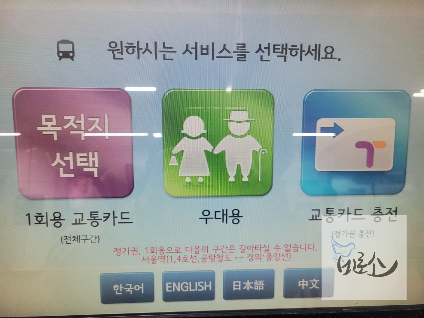 서울 전철 티켓 자판기는 한국어, 영어, 일본어, 중국어 4개 언어로 구매할 수 있다.