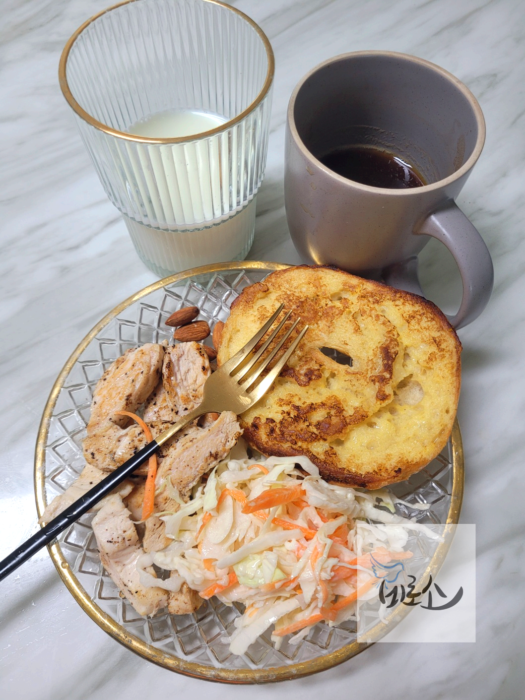 나는 베이글 반쪽과 양배추 당근 샐러드, 구운 허브 닭가슴살, 커피 우유와 함께 느긋하게 브런치를 즐겼다.