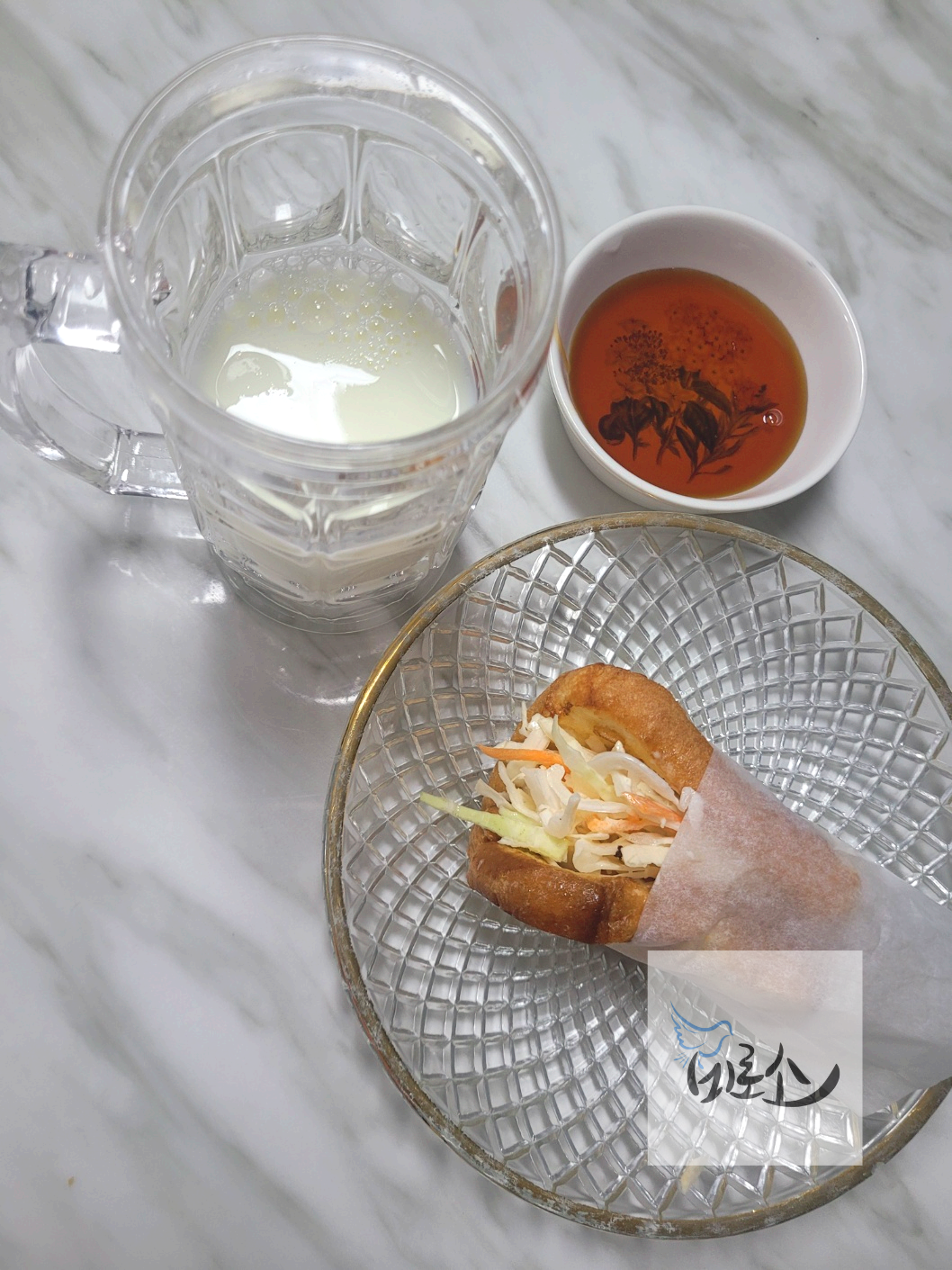 프렌치 토스트 한장에 야채를 끼워 넣고 반을 접어서 꿀과 함께 내놓았다. 음료는 흰우유가 제격이겠지? 아삭한 식감과 부드럽고 고소한 빵이 어우러져서 식감 폭발할거라고 상상했다. 시식은 남편이 했는데 먹으면서 하는 말은 '나는 빵을 좋아하지 않아.' (어쩌라고)