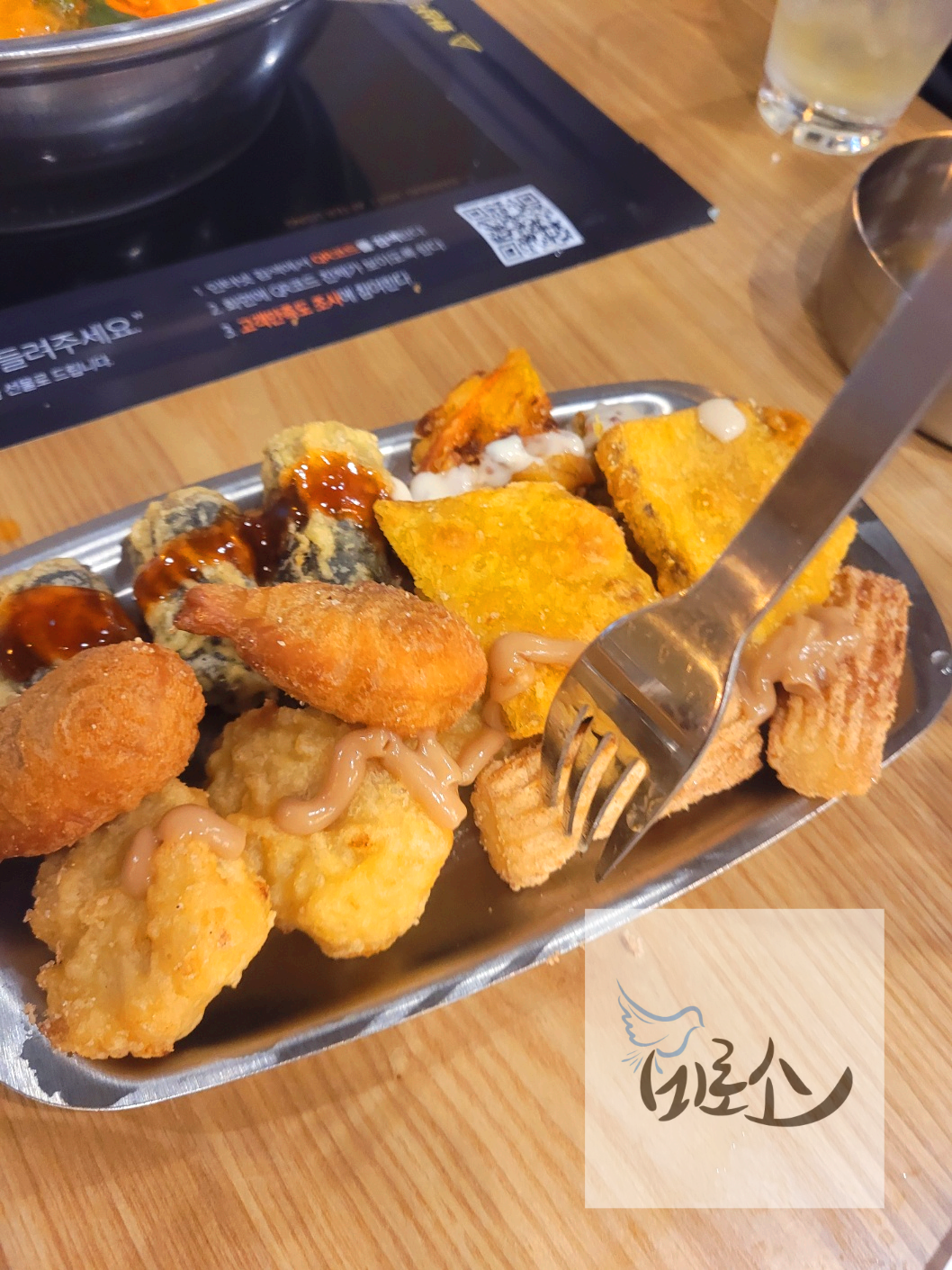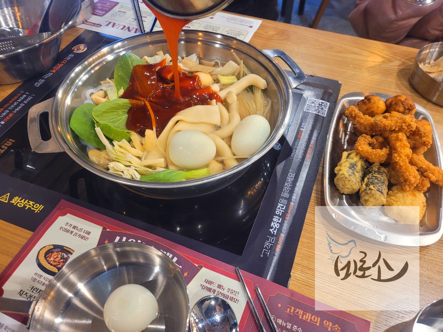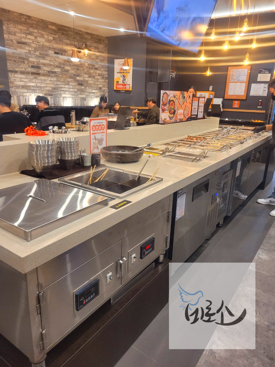 손잡이 달린 소스 그릇에는 반대편에 마련된 소스를 한 두 가지 믹스하거나 하나만 순정으로 골라 담아 오면 된다. 한편에는 라면을 커스텀해서 먹을 수 있게 재료와 면이 준비되어 있는데 우리는 떡볶이에 면사리로 추가만하고 라면을 끓여먹지는 않았다. 홈페이지에서는 라면 면치기하는 이벤트도 진행중이라고 하는데 다음에는 도전해봐야겠다.