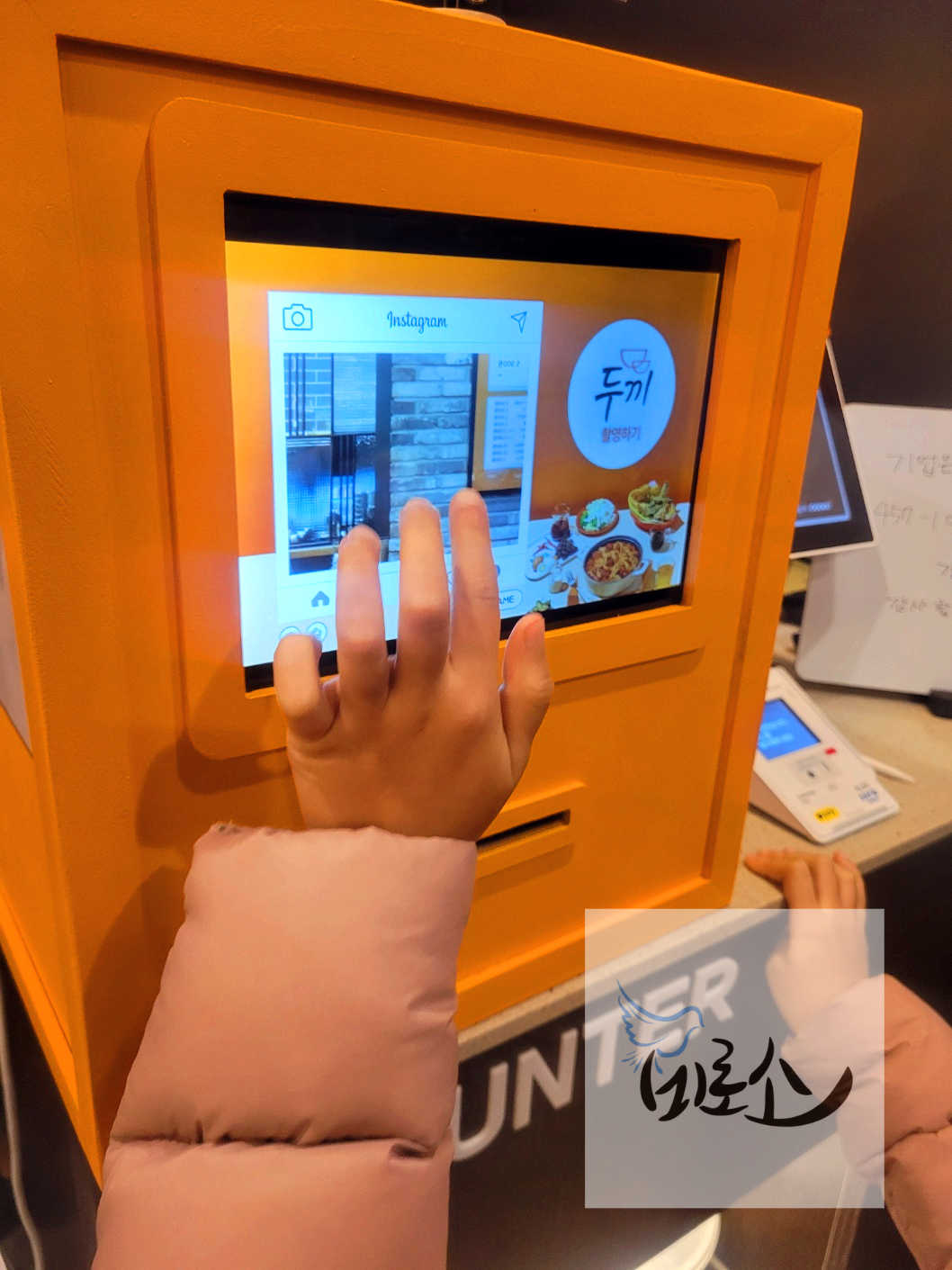 계산할 때 즉석 사진기가 있는데 높이를 맞춰서 다가가면 화면에 모습이 나타나고 촬영하기를 누르면 사진이 나온다. 컬러는 아니고 영수증 재질의 종이에 나오는데 매장을 나가면서도 소소한 선물을 받는 기분이라 좋았다. 즉석 떡볶이집에서 즉석 사진기라니. 두끼가 마케팅을 잘하는 것 같다.