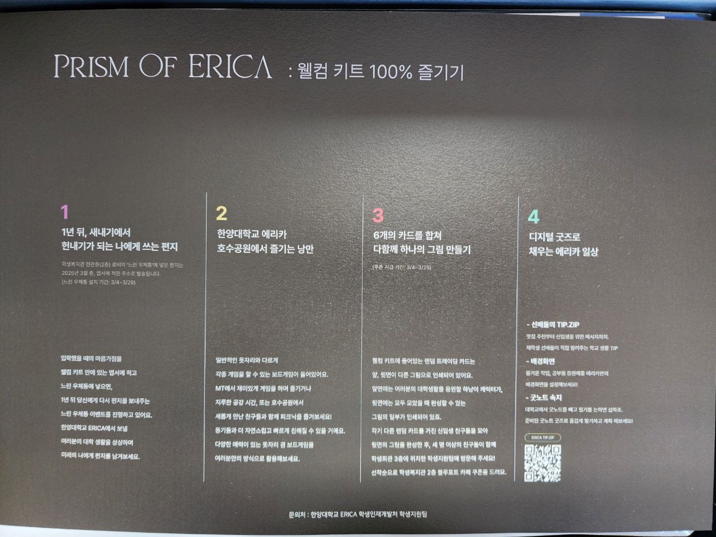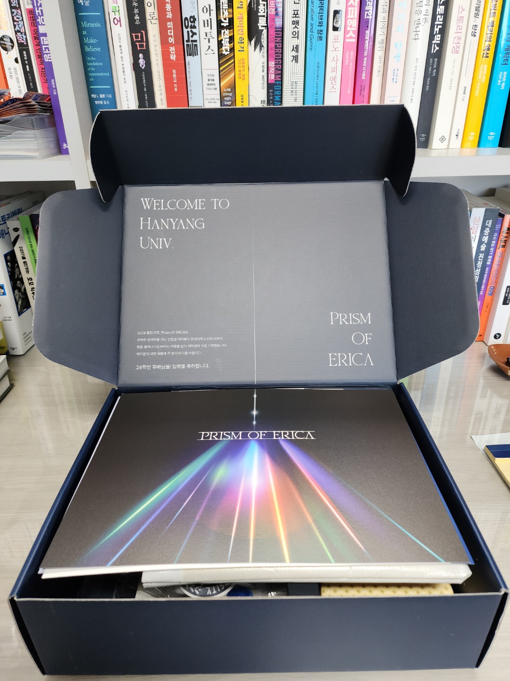 월컴키트의 네이밍은 PRISM OF ERICA다. 총천연색 다양한 학생들이 만들어 내는 프리즘을 모티브로 웰컴키트를 기획한듯 하다. 학교 정문의 학교 안과 바깥으로 향하는 독특한 건축 구조물도 에리카가 산학연을 기반으로 안으로 수렴하고 바깥으로 발산하는 것을 의미하는 것이라 기억하는데 그런 의미와 일맥 상통하는 네이밍이다.
