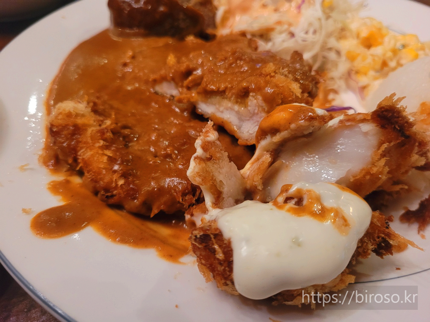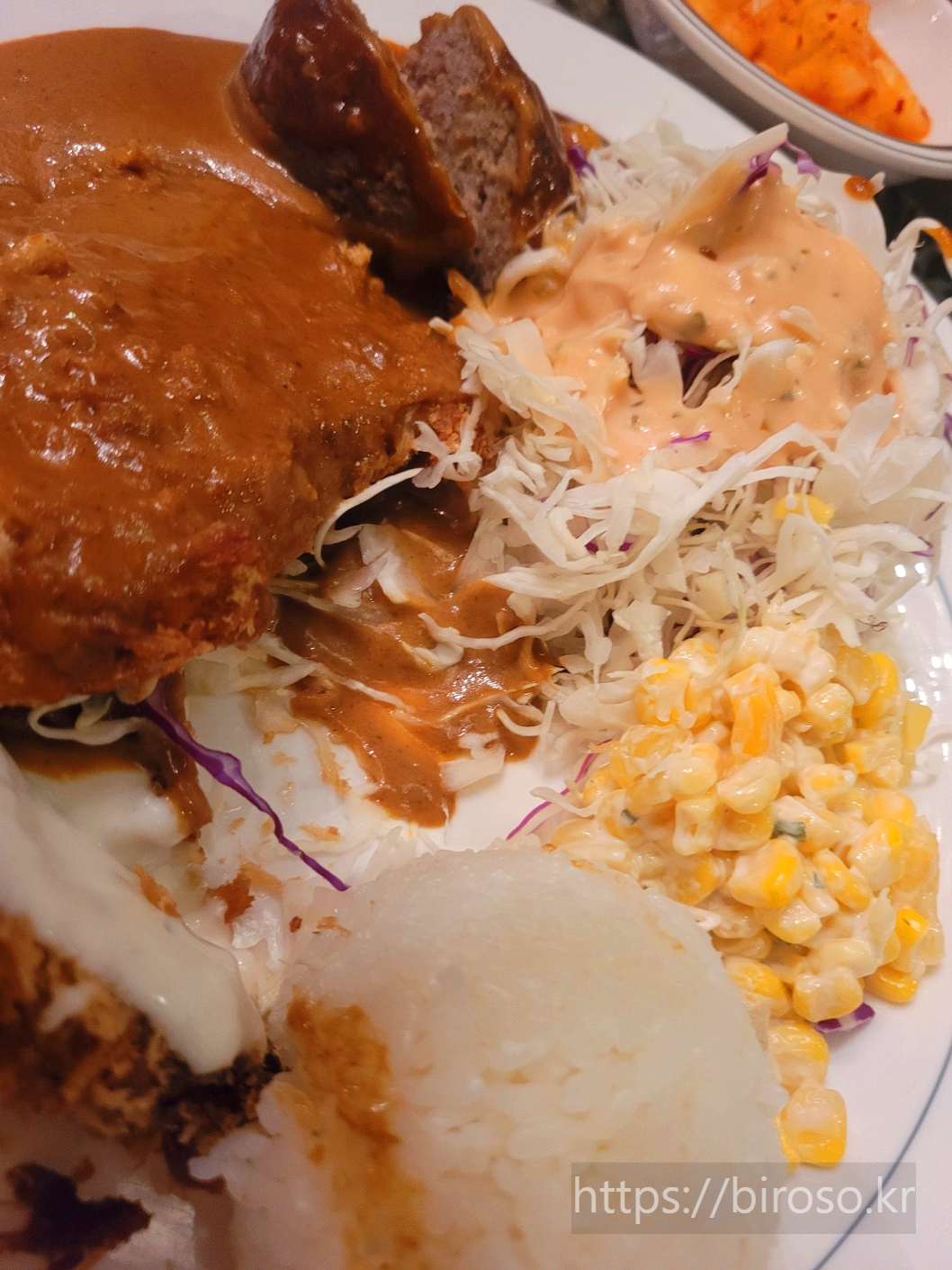 양배추 샐러드, 콘샐러드도 넉넉히 곁들여 나오고 깍두기도 함께 나와서 좋았다. 한국식 경양식집의 시그니처라고 할 수 있겠다. 블로그를 염두해 두고 각 단면을 잘라서 사진을 찍어보았는데 사진으로는 약간 먹다 찍은 사진 같아서 아쉽다.