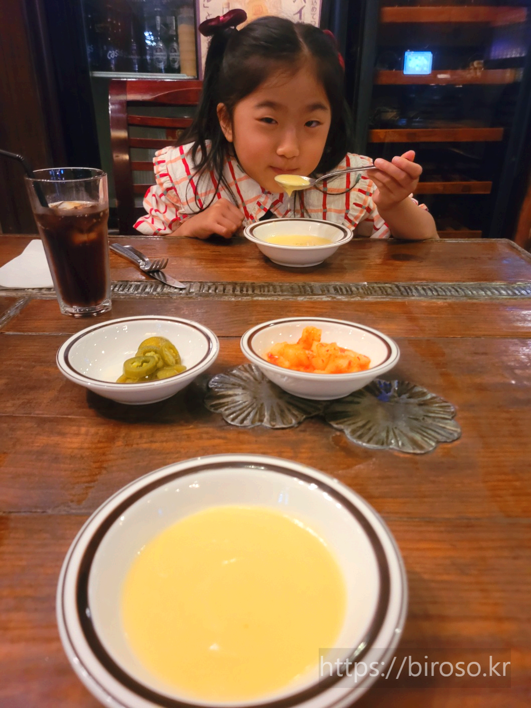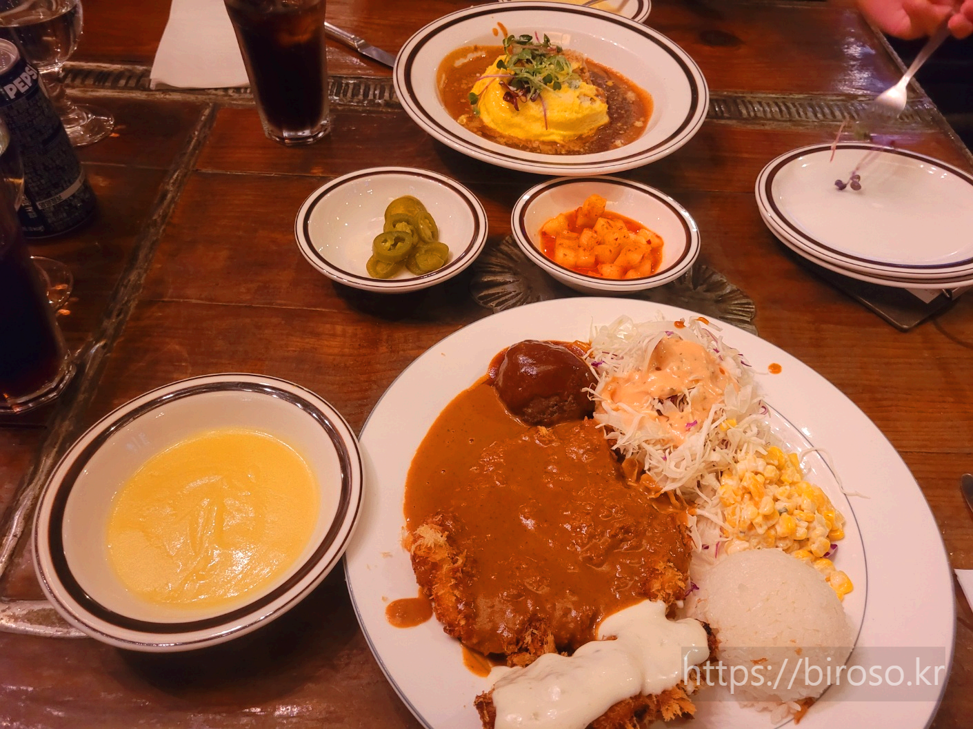 어린이날을 맞아 대우해주기 위해 특별히 제로 콜라도 하나 시켜주었다. 직원분이 센스있게 얼음잔을 두 개 주셔서 아이와 나누어 마시게 해주었다. 돈까스에는 콜라가 역시 잘 맞는다.