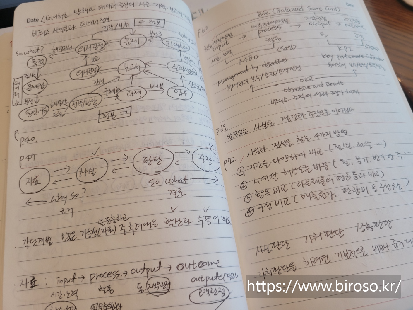그런 의미에서 <데이터로 말해요!>는 메모하고 챙겨야 할 것들이 많다. 특히 흐름과 논리를 위한 개념정리가 탁월하다. 보고서를 작성하는 사람들이 목적이나 대상을 파악하고 그에 맞게 어떤 내용으로 구성해야 하는 지에 대한 감을 익힐 수 있게 하기 때문이다.