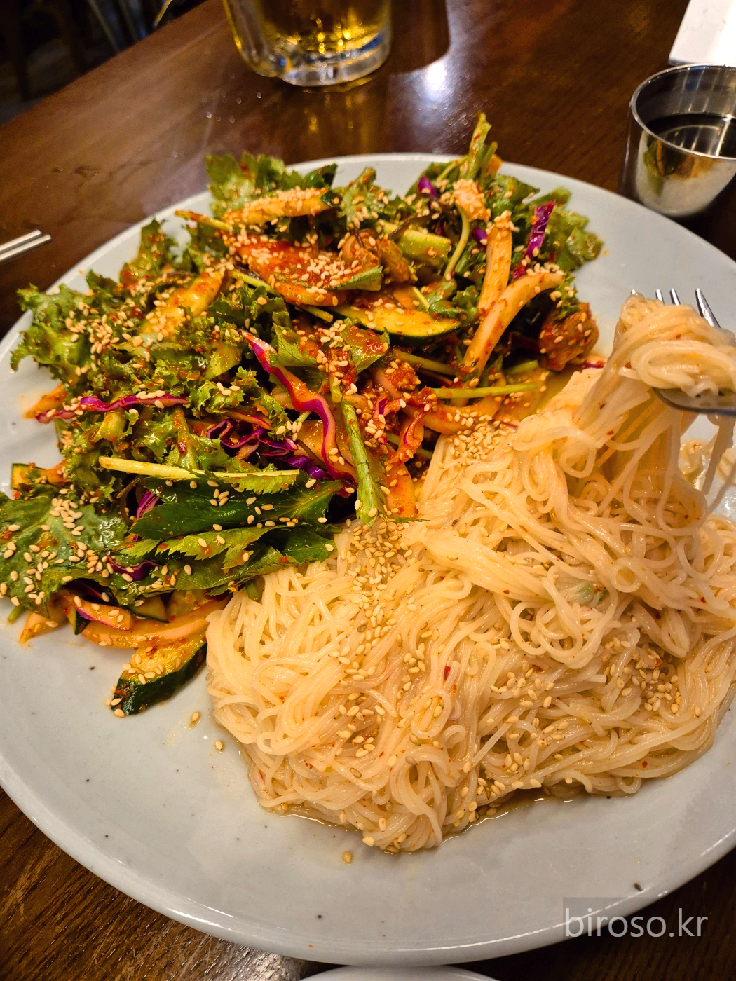 계열사의 부암동 골뱅이 국수는 면에 약간의 양념이 되어 나오기 때문에 나오면 전체를 섞지 말고 따로 먹는게 좋다고 안내 받았다. 이것마저 아이가 거의 다 가져다가 후루룩 먹는 바람에 오이골뱅이 무침만 거의 먹은듯 하다. 아이들 입맛에 제격이라서 치킨만 주기에 아쉬움이 있다면 골뱅이 국수도 추천한다.