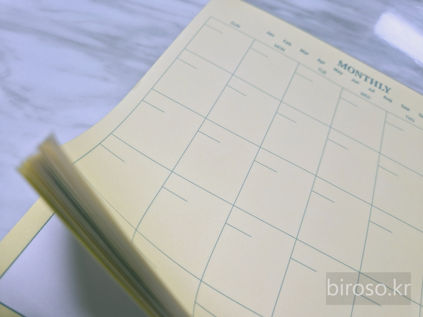 다이소에서 1000원에 구매한 월간 계획표(Monthly Scheduler)가 노란색으로 군더더기 없고 한장씩 낱장으로 뜯어서 쓸 수 있어서 활용하기 좋았다.