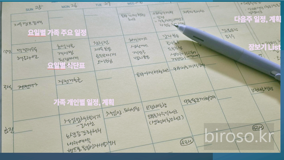 또한 가족의 일정을 나 혼자 알고 있는 것보다 서로의 일정을 알고 있는 것이 좋다. 그래서 냉장고에 주간 일정을 적어두고 서로의 일정을 알도록 붙여두니 편리했다. 서로 일정을 공유하고 새로운 일정이 생기면 적어두었다. 그렇게 하면 일정이 없는 날 필요한 일정을 계획해서 적어두고 실행할 수도 있어 좋다.