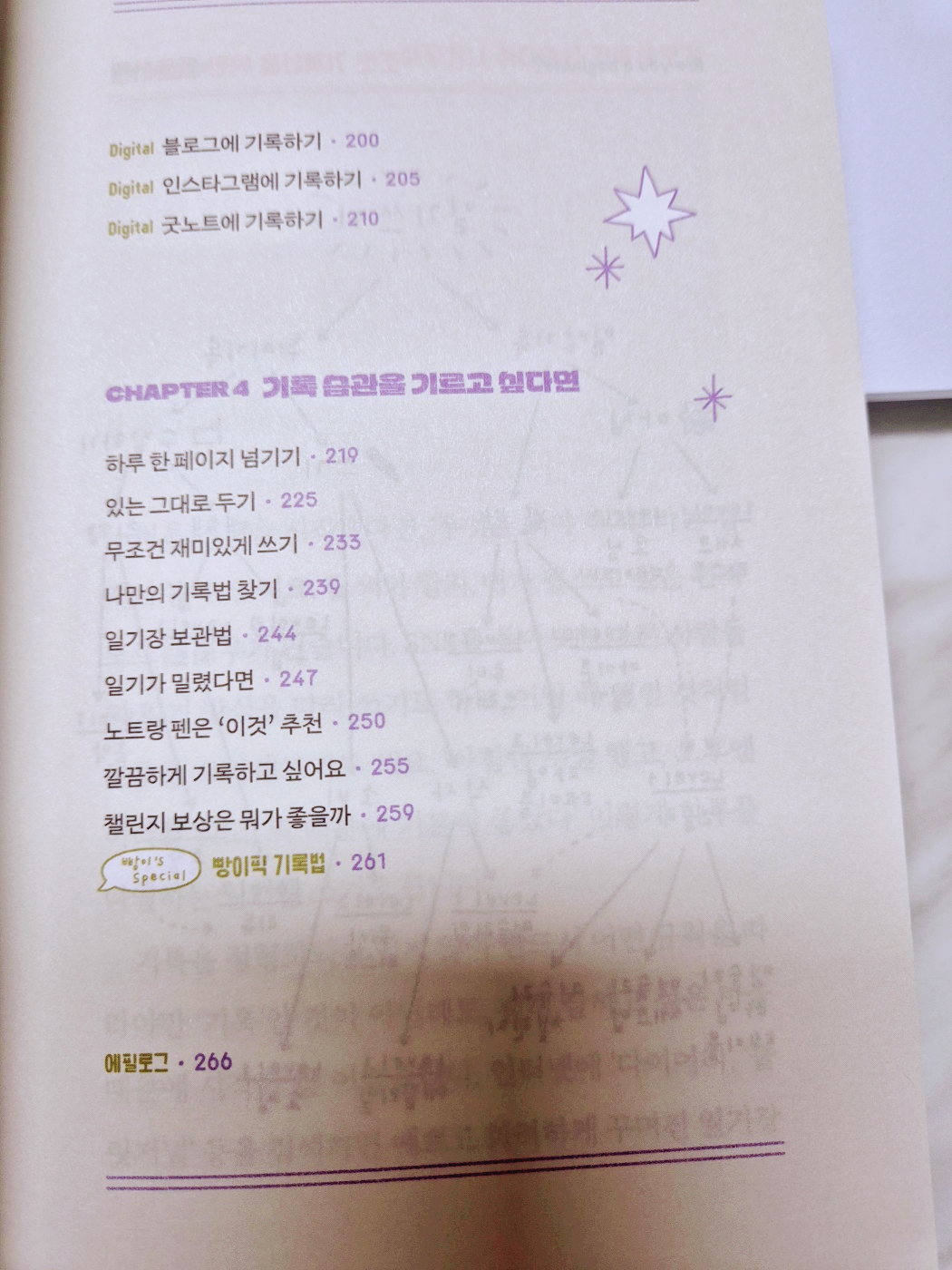 목차는 기록의 종류, 활용, 방법, 도구로 구성되어 있다. 일단 다이어리를 꾸준히 쓰지 않은 사람들이라면 어디에 무엇을 기록해야 하는지 어리둥절하다. 특히 워킹맘의 경우는 개인, 가족, 회사에 관한 여러 층위가 뒤섞이는 경우가 많다. 기존 다이어리의 포맷을 나에게 맞춰 변화를 주려고 하는 것도 그래서다.