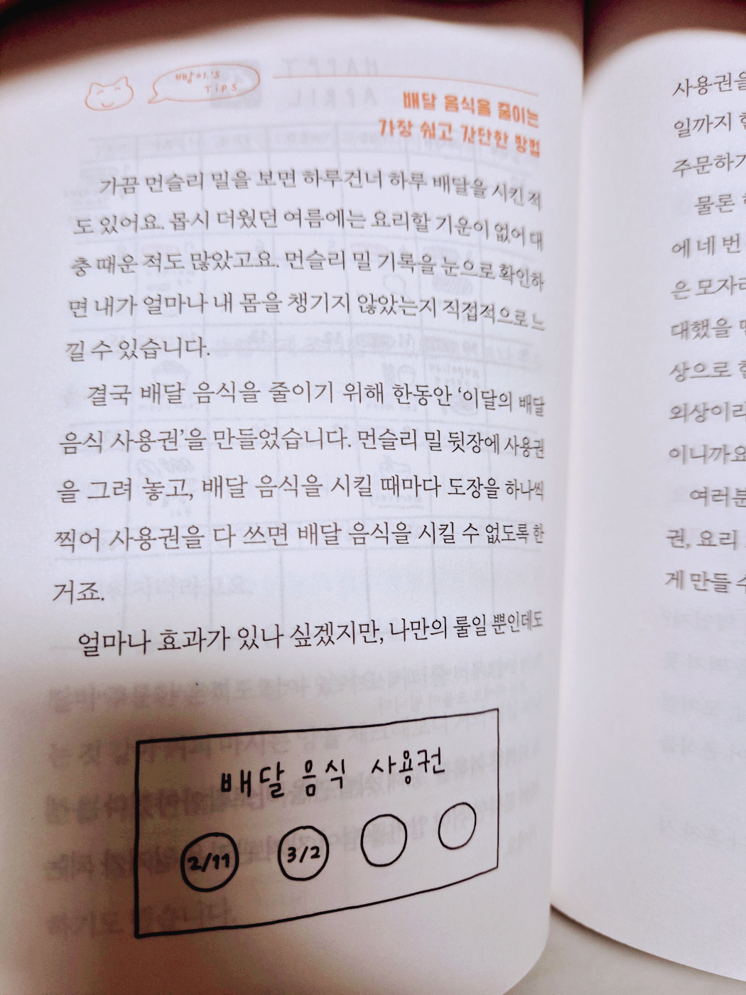 나 역시 이런 장치들을 기록의 중간에 활용할 계획이다. 나의 성과를 눈으로 확인하고 그것을 통해 조금씩 성장하는 나를 자각하는 것이다. 또한 좋지 않은 습관을 자제하기 위한 장치로 배달음식 사용권을 사용하는 것도 좋을 것 같다. 남편과 음주 횟수를 줄이려고 하는데 이런 사용권을 쓰게 된다면 재미있게 눈으로 실감하면서 활용할 수 있을 것 같다.