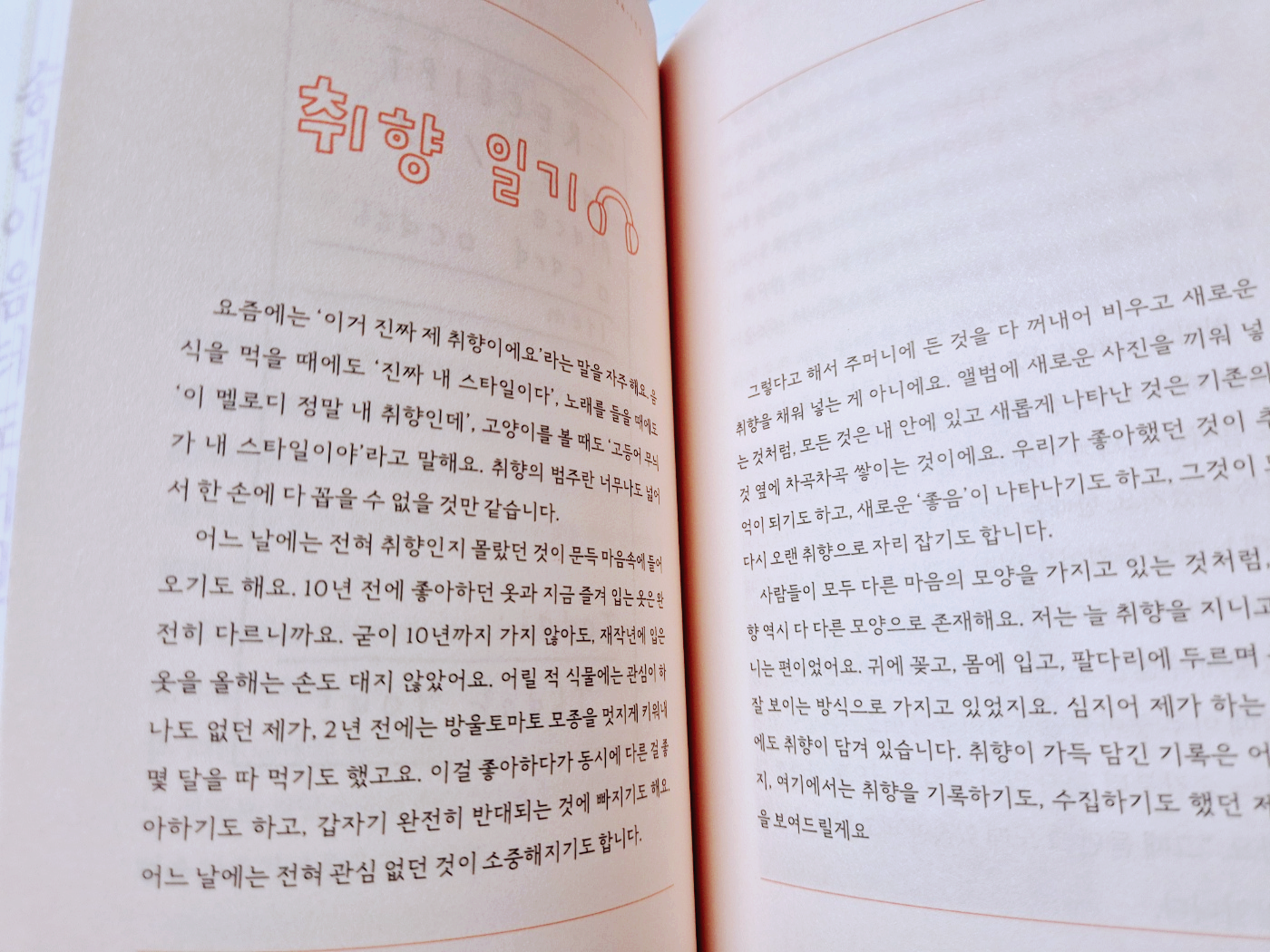그런 점에서 취향일기는 워킹맘들에게 꼭 필요한 일기라고 생각한다. 나 자신을 이해하고 존중할 수 있는 사람이 다른 사람들과의 관계를 잘 유지할 수 있고 행복을 느끼기 쉽기 때문이다.