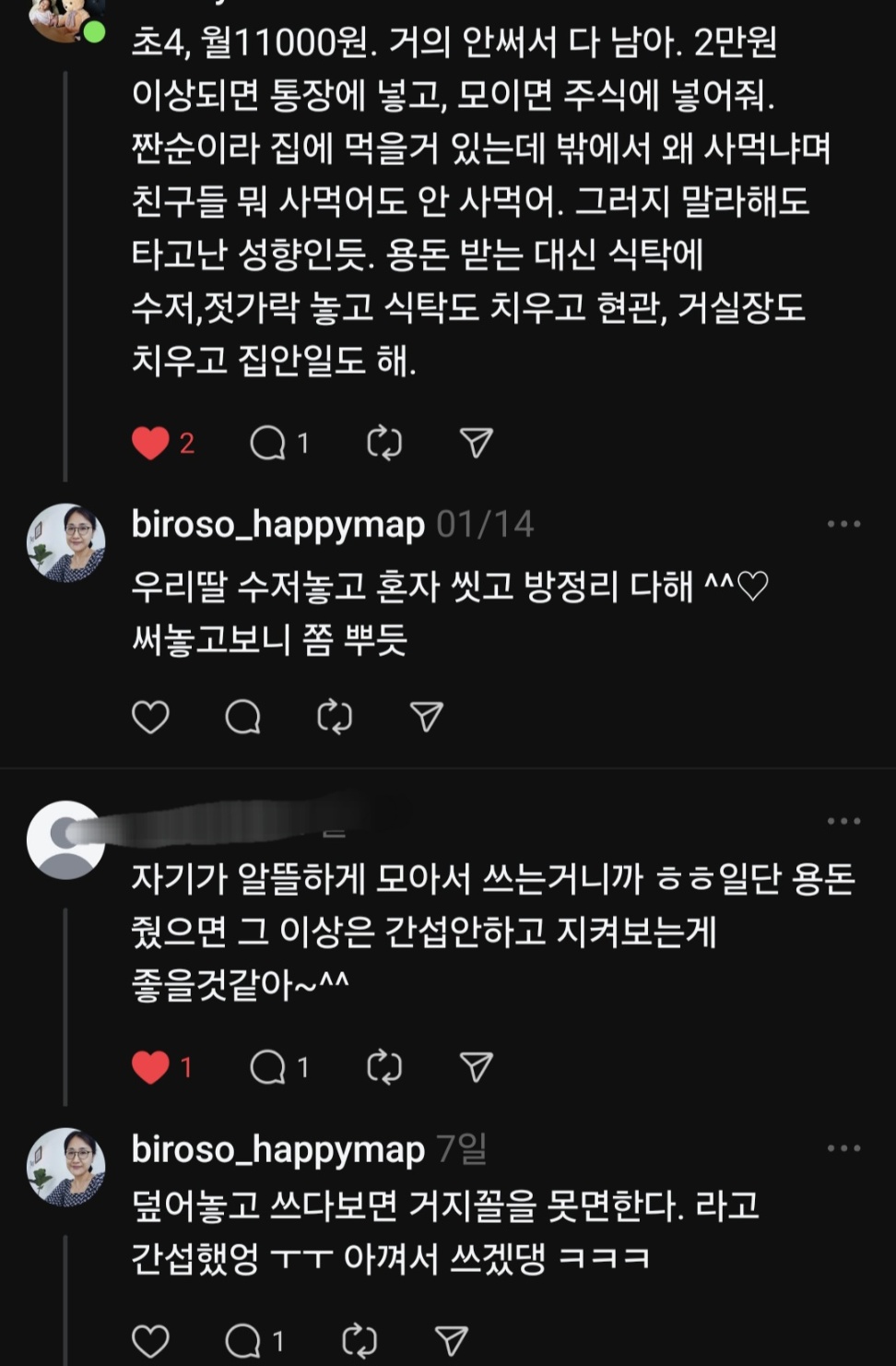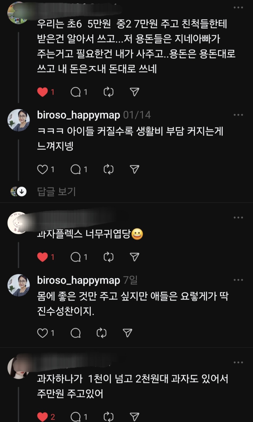 스레드에 친구들에게 용돈을 어떻게 주고 있는지 물었더니 다양한 답변이 나왔다. 용돈을 주지 않은 친구들도 있었지만, 그들도 용돈을 직접 관리하는 것이 필요하다고 생각한다는 댓글을 달았다.