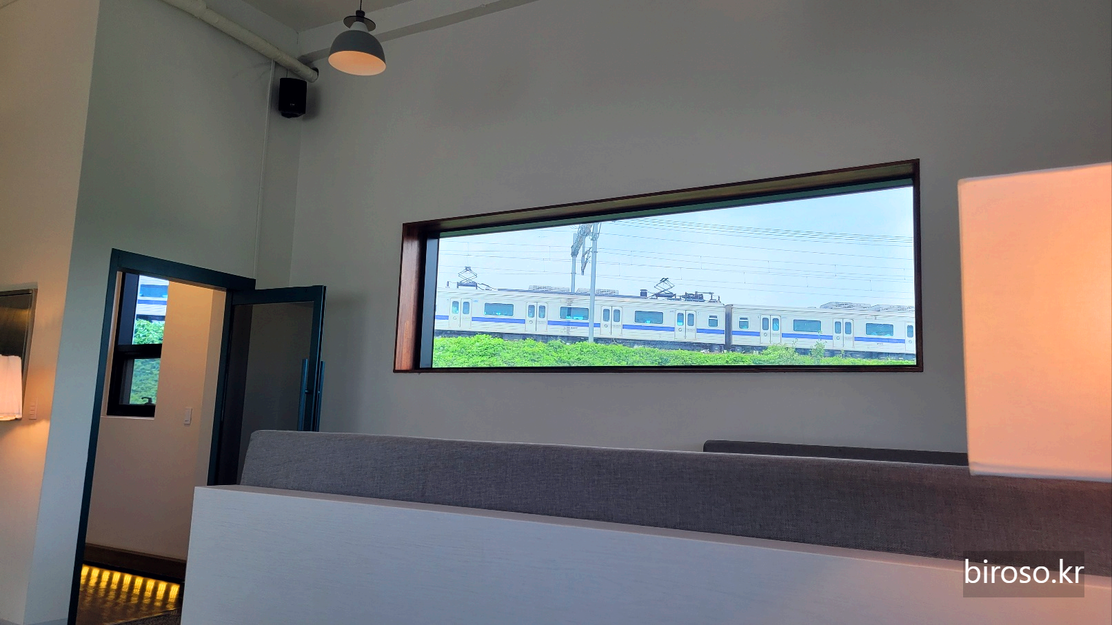 반면 카페에 앉은 사람은 전철이 오가는 풍경을 10분 정도 간격으로 지켜볼 수 있다. 그 풍경 잘 보라고 창문은 가로로 널찍하게 빼 두었다는 것도 매력 포인트