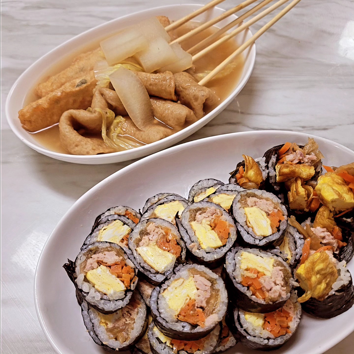 오늘은 꼬치 어묵탕을 같이 끓였다. 당근, 달걀 지단을 부치기 전에 물을 올리고 시판 꼬치 어묵탕(마트에 요새 어육 100%로 잘 나온다. 육수 스프도 준비되어 있어서 무랑 기호에 맞는 양념을 첨가하면 된다.)을 준비했다. 탱글한 식감에 따뜻한 국물이 김밥과 찰떡 조합이 된다.