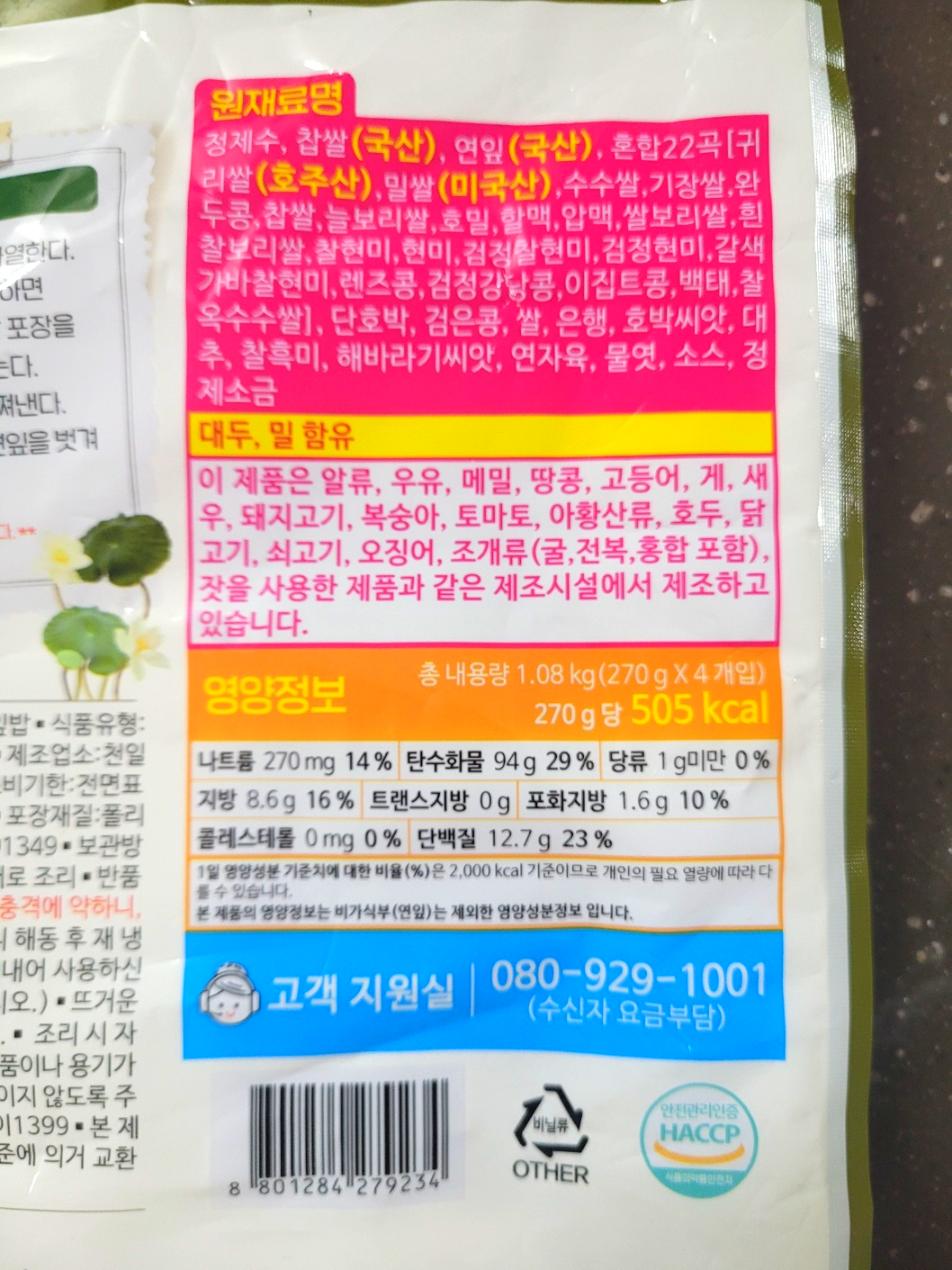 개당 270g으로 조금 많은편이다. 칼로리는 양도 많고 찰밥이라 500칼로리정도다. 잡곡과 콩이 들어있어서 단백질이 12.7g들어있고 당류는 1g 미만이라 건강한 비율로 영양이 골고루 들었다. 찰기가 있고 양이 많아서 반찬 많이 차리고 채소를 곁들여 먹을 생각으로 한 개를 반으로 나누어 먹는게 좋았다.
