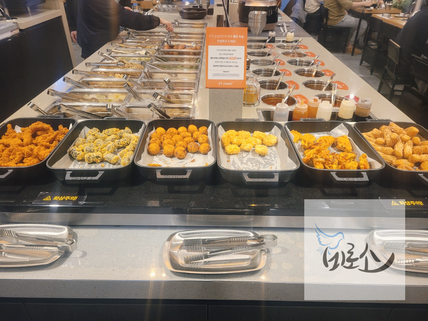 튀김류도 먹기 좋은 크기로 그때그때 채워지고 있었다. 두끼 떡볶이에 가는 이유 중에 하나가 내맘대로 다양한 재료를 즐기는 떡볶이도 있지만 튀김을 마음껏 먹을 수 있다는 것도 크다. 이날은 치킨, 김말이, 다코야끼, 탕수튀김, 야채튀김, 고구마튀김, 츄러스, 미니붕어빵이 있었다.